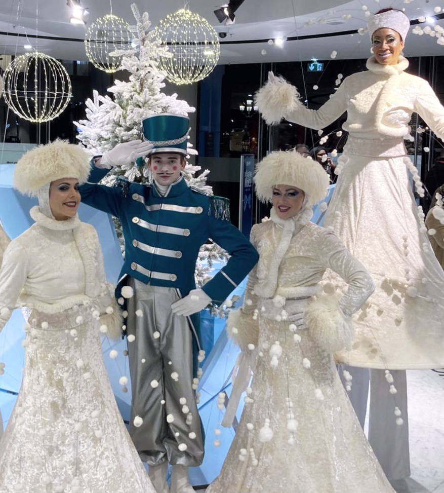 Dix personnages entament une douce marche dansante, rythmée par une chorégraphie harmonieuse. Vêtues de grandes robes en velours blanc, de jolis flocons, gravitent autour de nos jolies danseuses.  Elles tourbillonnent avec légèreté. Un comédien robot fascine les enfants dans sa danse saccadée et nous captive dans cette procession magique. Une échassière guide la troupe et le public, dans le grand circuit enchanté de l’hiver, et veille à ce que tout le monde profite du spectacle. La musique réchauffe l’ambiance et grâce aux bâtons lumineux, tout le monde participe à la marche.